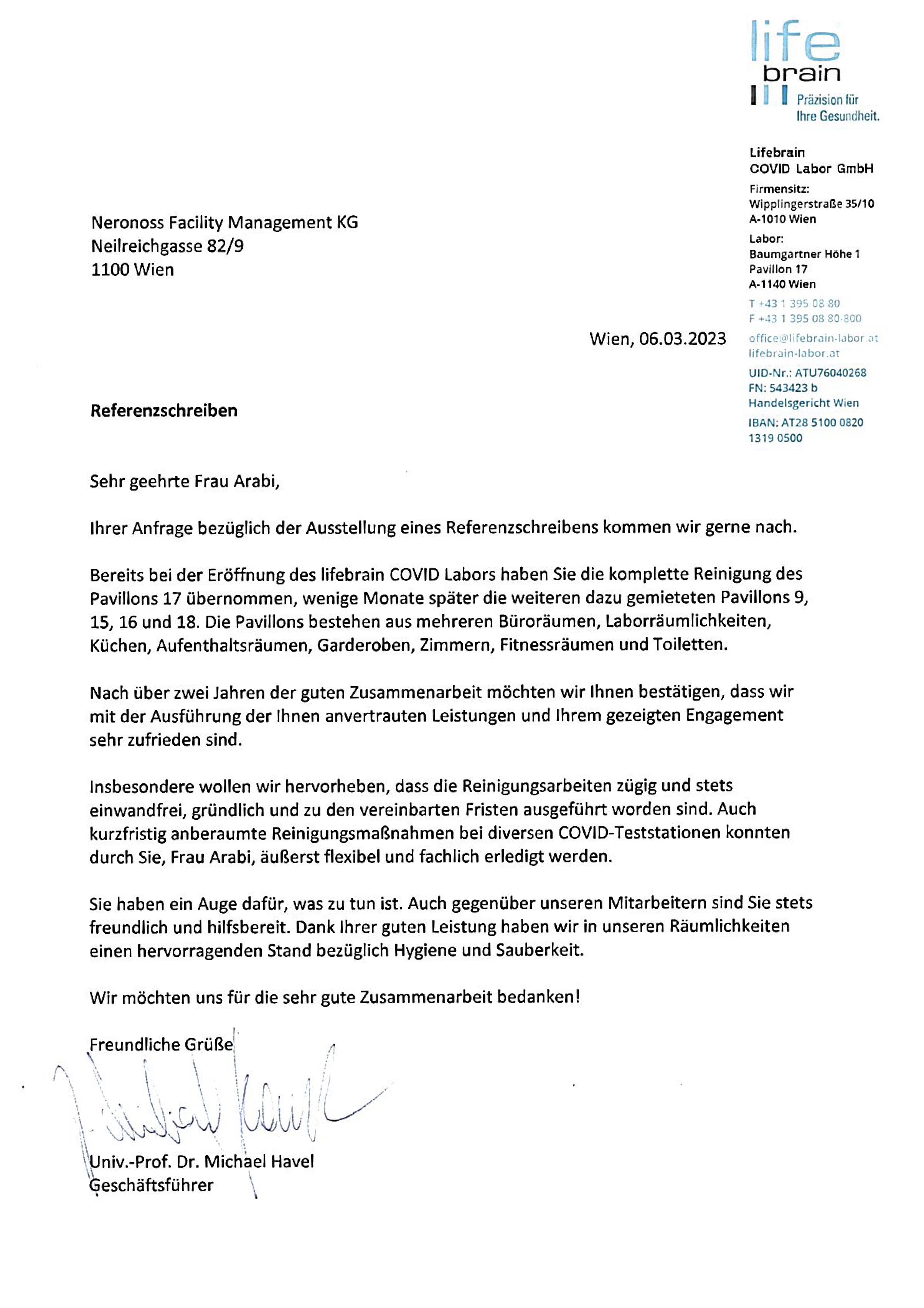 Bereits bei der Eröffnung des lifebrain COVID Labors haben Sie die komplette Reinigung des Pavillons 17 übernommen, wenige Monate später die weiteren dazu gemieteten Pavillons 9, 15, 16 und 18. Die Pavillons bestehen aus mehreren Büroräumen, Laborräumlichkeiten, Küchen, Aufenthaltsräumen, Garderoben, Zimmern, Fitnessräumen und Toiletten. Nach überzwei Jahren der guten Zusammenarbeit möchten wir Ihnen bestätigen, dass wir mit der Ausführungd e r Ihnen anvertrautenLeistungen und Ihrem gezeigten Engagement sehr zufrieden sind. Insbesondere wollen wirhervorheben, dass die Reinigungsarbeiten zügig und stets einwandfrei,gründlich und zu den vereinbarten Fristen ausgeführt worden sind. Auch kurzfristig anberaumte Reinigungsmaßnahmen bei diversen COVID-Teststationen konnten durch Sie, Frau Arabi, äußerst flexibel und fachlich erledigt werden. Sie haben ein Auge dafür, was zu tun ist. Auch gegenüber unseren Mitarbeitern sind Sie stets freundlich und hilfsbereit. Dank Ihrer gutenLeistung haben wir in unseren Räumlichkeiten einen hervorragendenStand bezüglich Hygiene und Sauberkeit. Wir möchten uns für die sehr gute Zusammenarbeit bedanken!